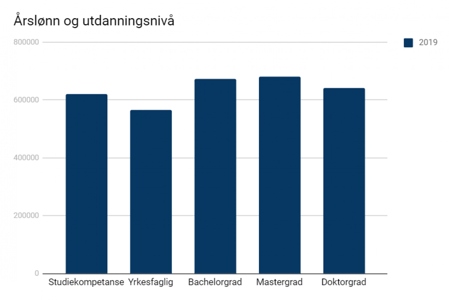 Utdanningsnivå holder seg noenlunde likt som i fjor (2018: mastergrad 60 %, bachelorgrad 29 %), 57 % har mastergrad, mens bachelorgrad ligger på 32 %.