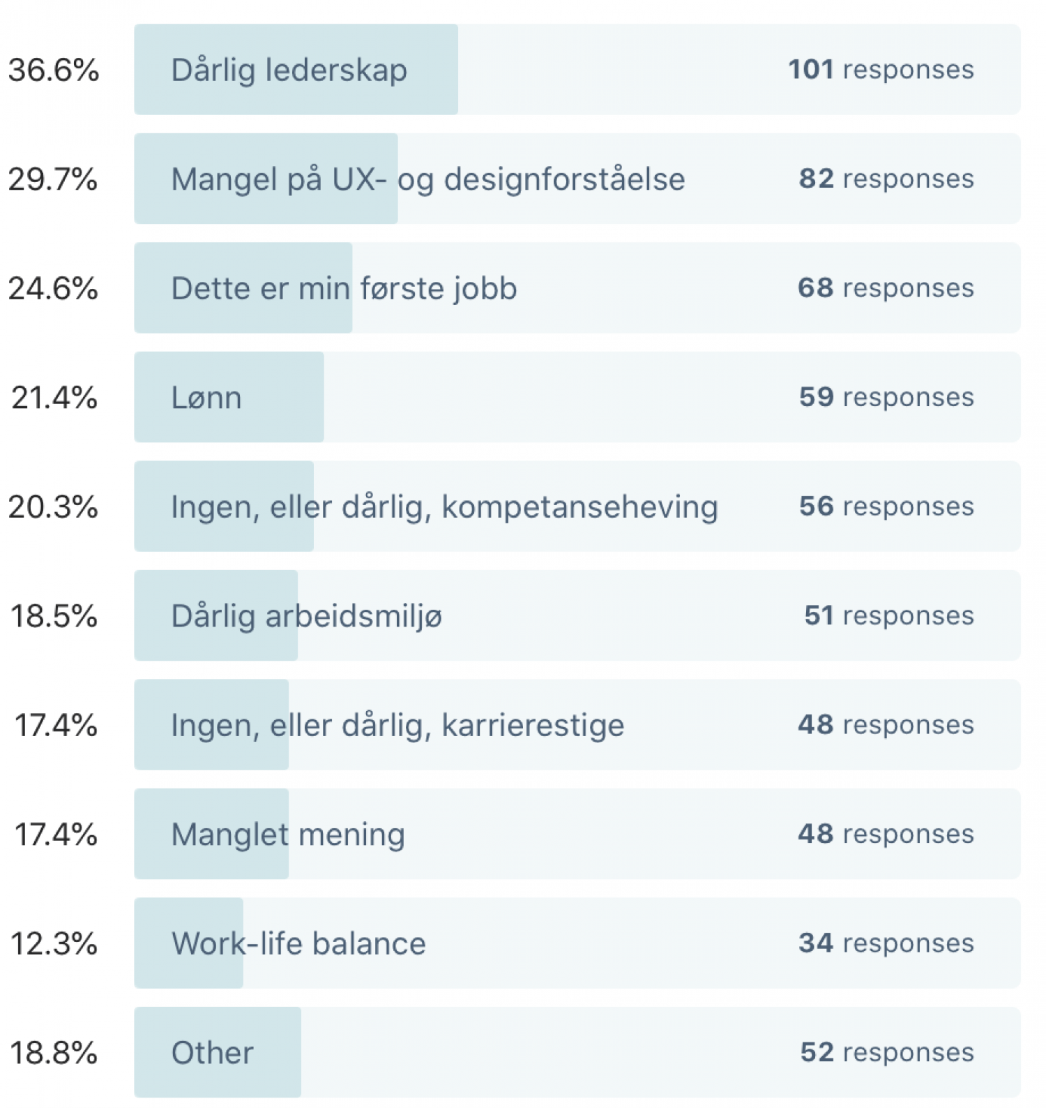Mangel på UX- og designforståelse ligger på en andreplass med 30 %. Dette kan også være en parallell til utfordringene med å forsvare sin posisjon eller at rollen som UX er undervurdert.
