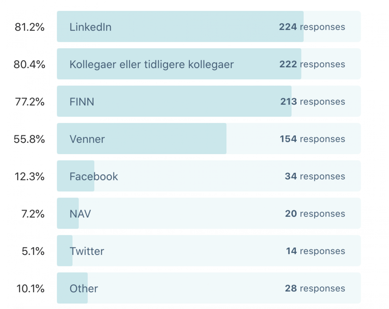 Hvis de var på jobbjakt ville 81 % brukt Linkedin (i likhet med Sverige) eller snakket med kollegaer og tidligere kollegaer. 77 % ville benyttet seg av FINN. Disse tre alternativene er klare favoritter, men også privat nettverk (venner, 55 %) er en mye brukt kanal.