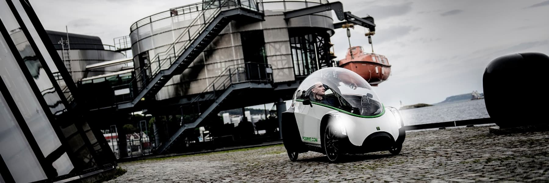 Podbike er en værsikker elsykkel som er bygget som en liten bil, med fire hjul, tak og vegger.